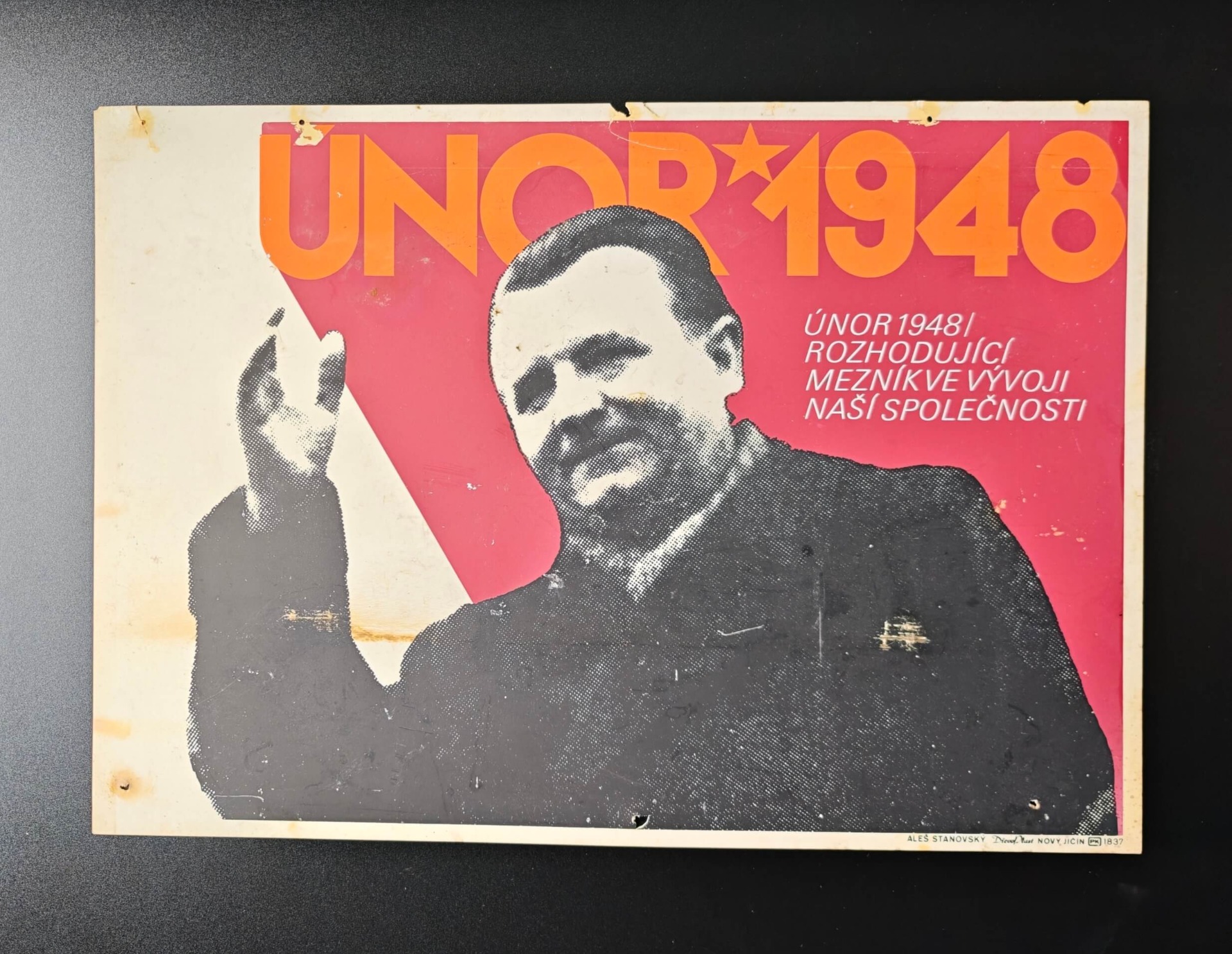 Nabízím k prodeji originální velkoformátovou ceduli z období socialistického Československa. Tato tabule s portrétem Klementa Gottwalda byla vydána k výročí událostí února 1948. Jde o autentický kus dobové politické propagandy, který v 70. a 80. letech zdobil veřejné prostory a nástěnky národních podniků.