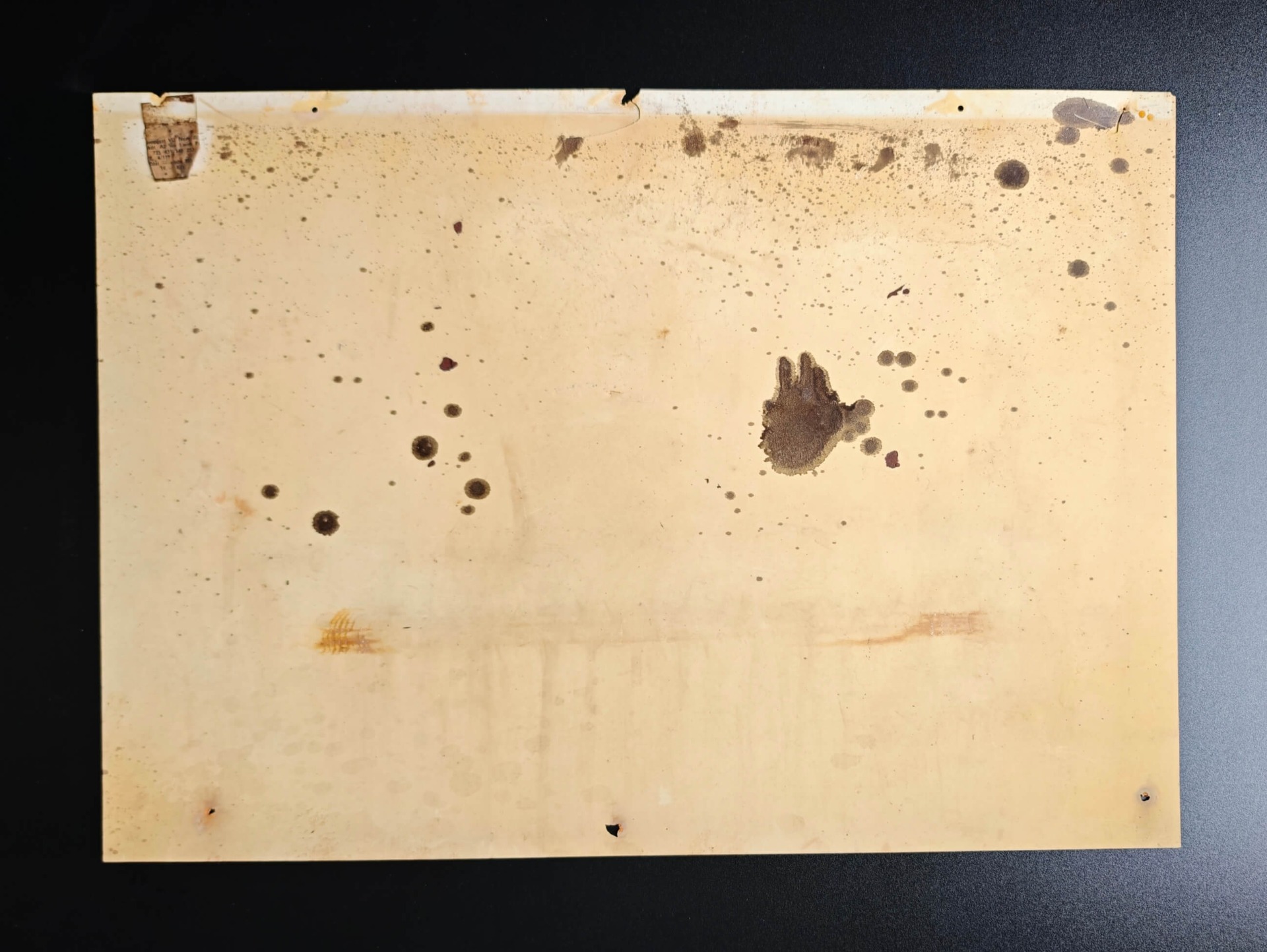- Stav: Nálezový stav s výraznou patinou. Cedule nese stopy času – oděrky, mírné zašpinění a stopy po dřívějším uchycení (vše viz detailní fotografie). Zadní strana nese stopy po lepidle či barvě, což však nijak neovlivňuje čelní stranu s grafikou.