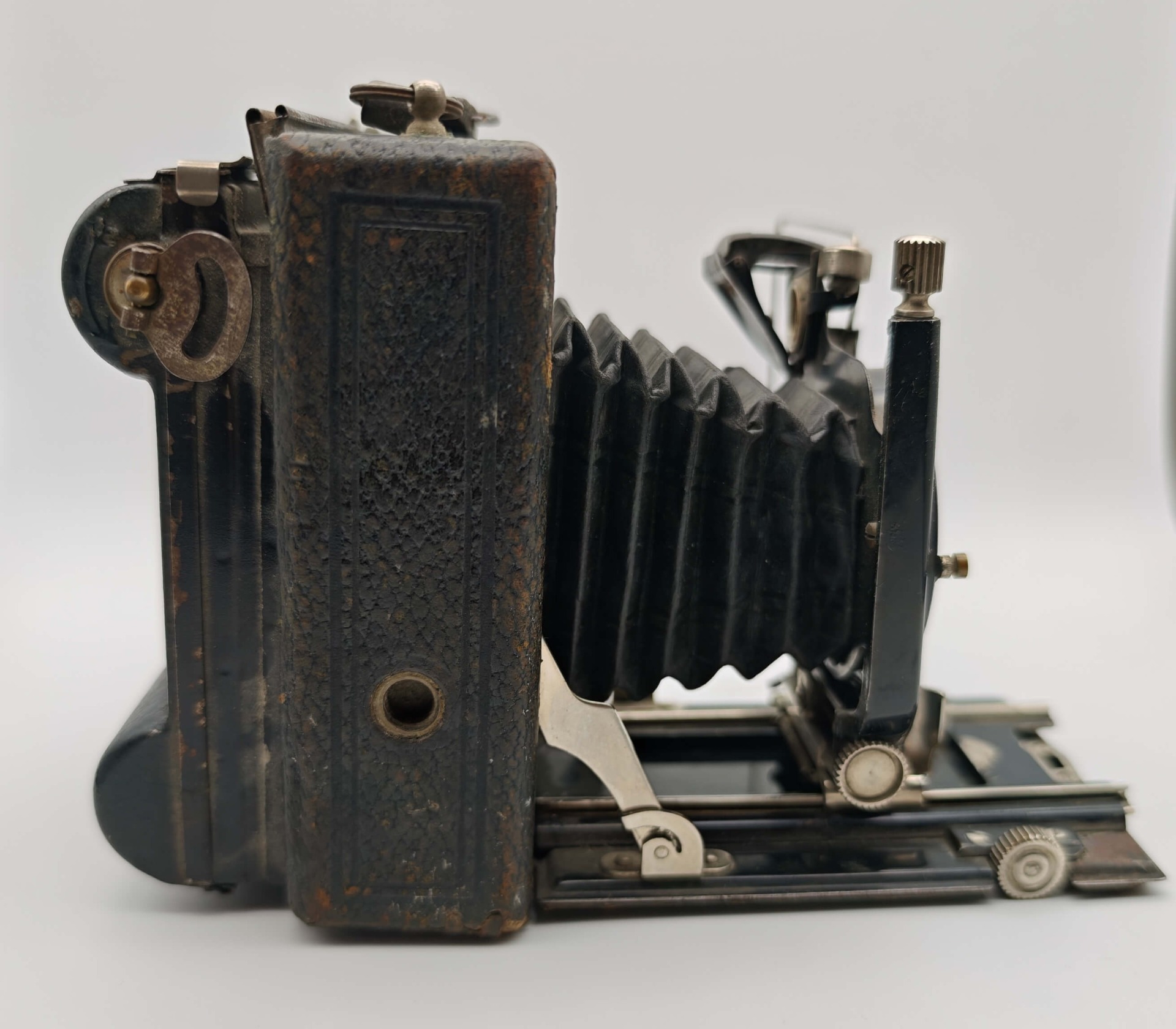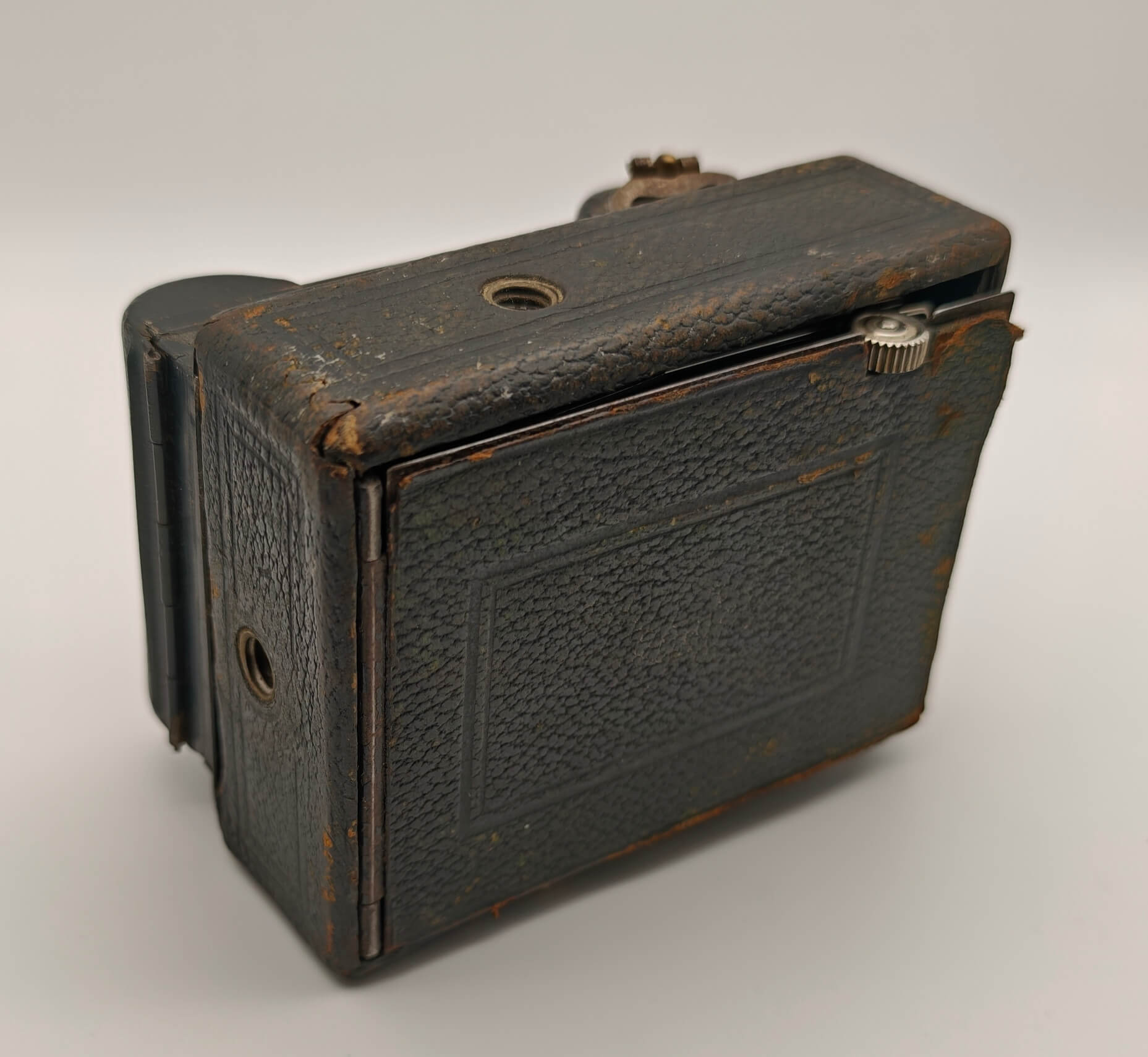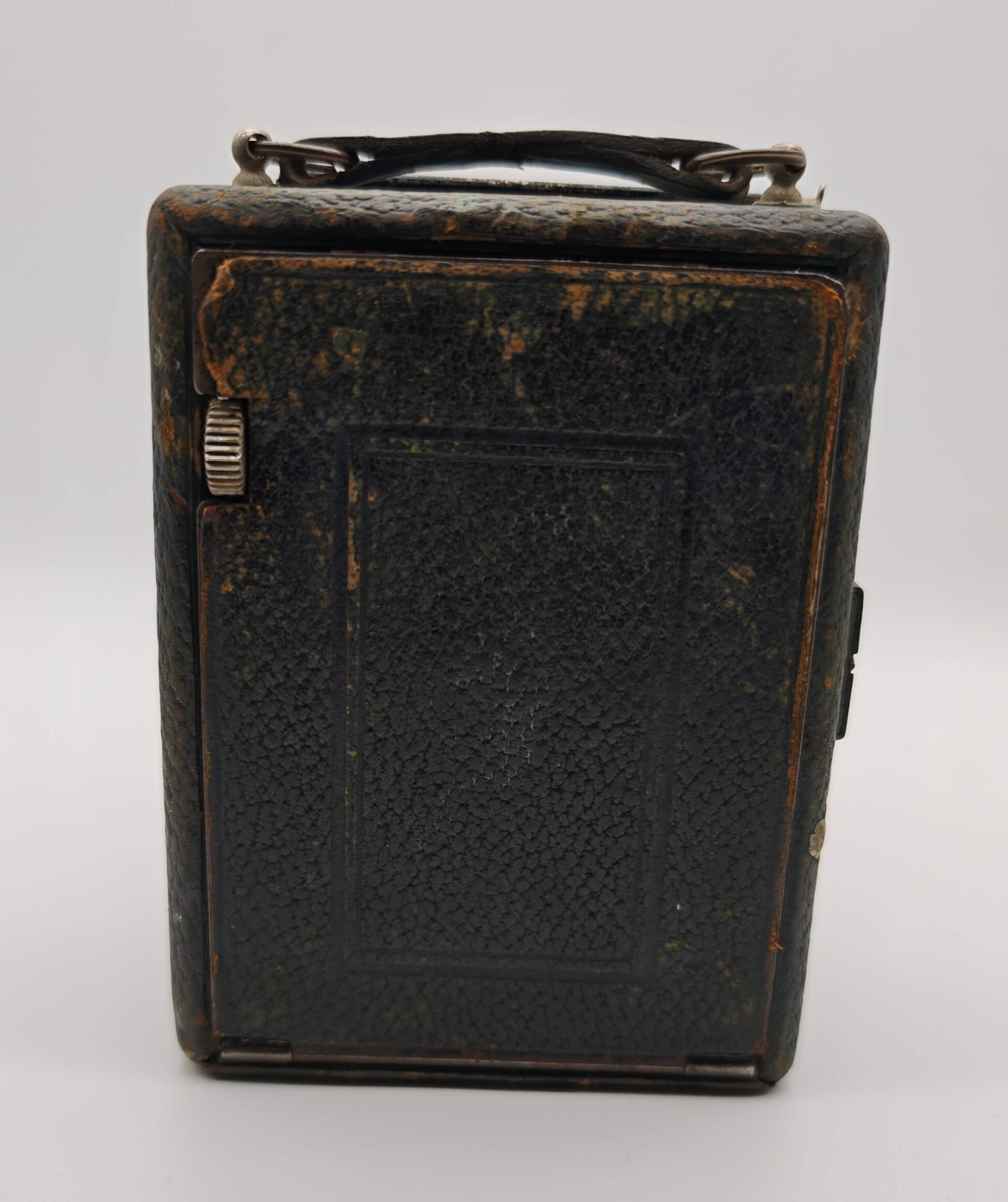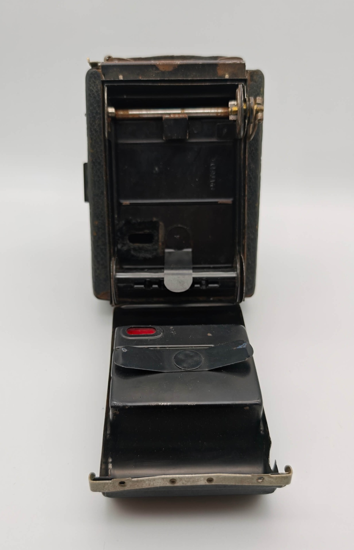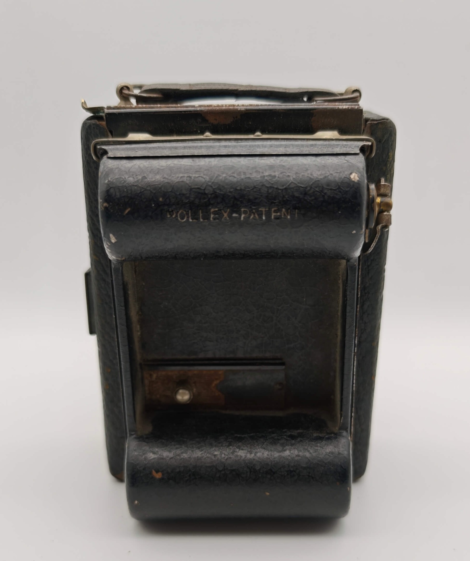 - Stav: Nálezový stav s patinou. Tělo přístroje nese v horní části naprasklinu (viz foto). Přední sklopnou část nelze v tuto chvíli zcela dovřít (mechanismus je zatuhlý a vyžaduje vyčištění či promazání). Koženkový polep odpovídá stáří a nese stopy opotřebení.