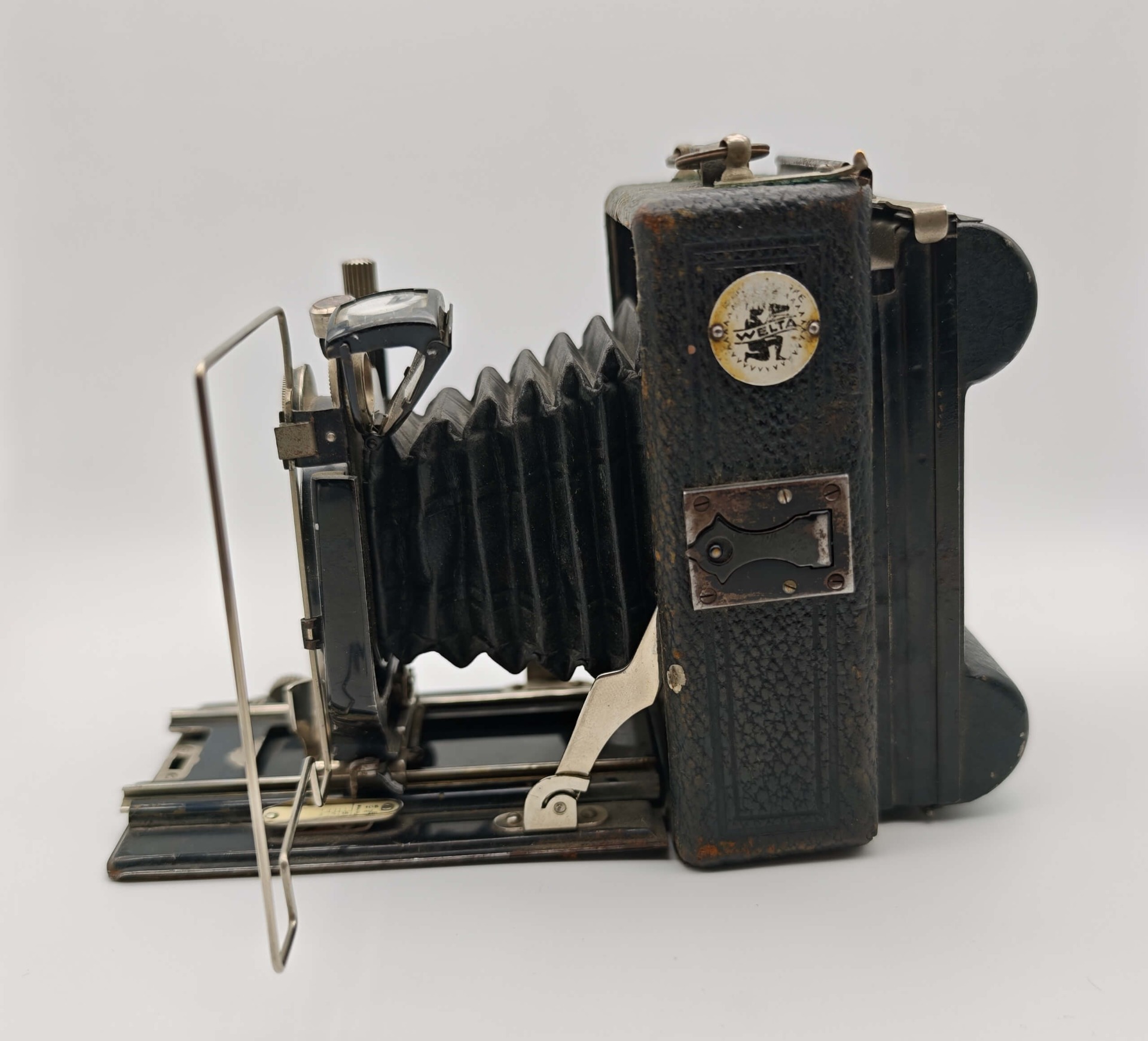 Nabízím k prodeji historickou sklopnou komoru od renomovaného německého výrobce Welta. Přístroj v sobě spojuje mechaniku 30. let 20. století a legendární optiku G. Rodenstock München. Jde o autentický kus technické historie s výraznou nálezovou patinou, určený k dekoraci či odborné renovaci.