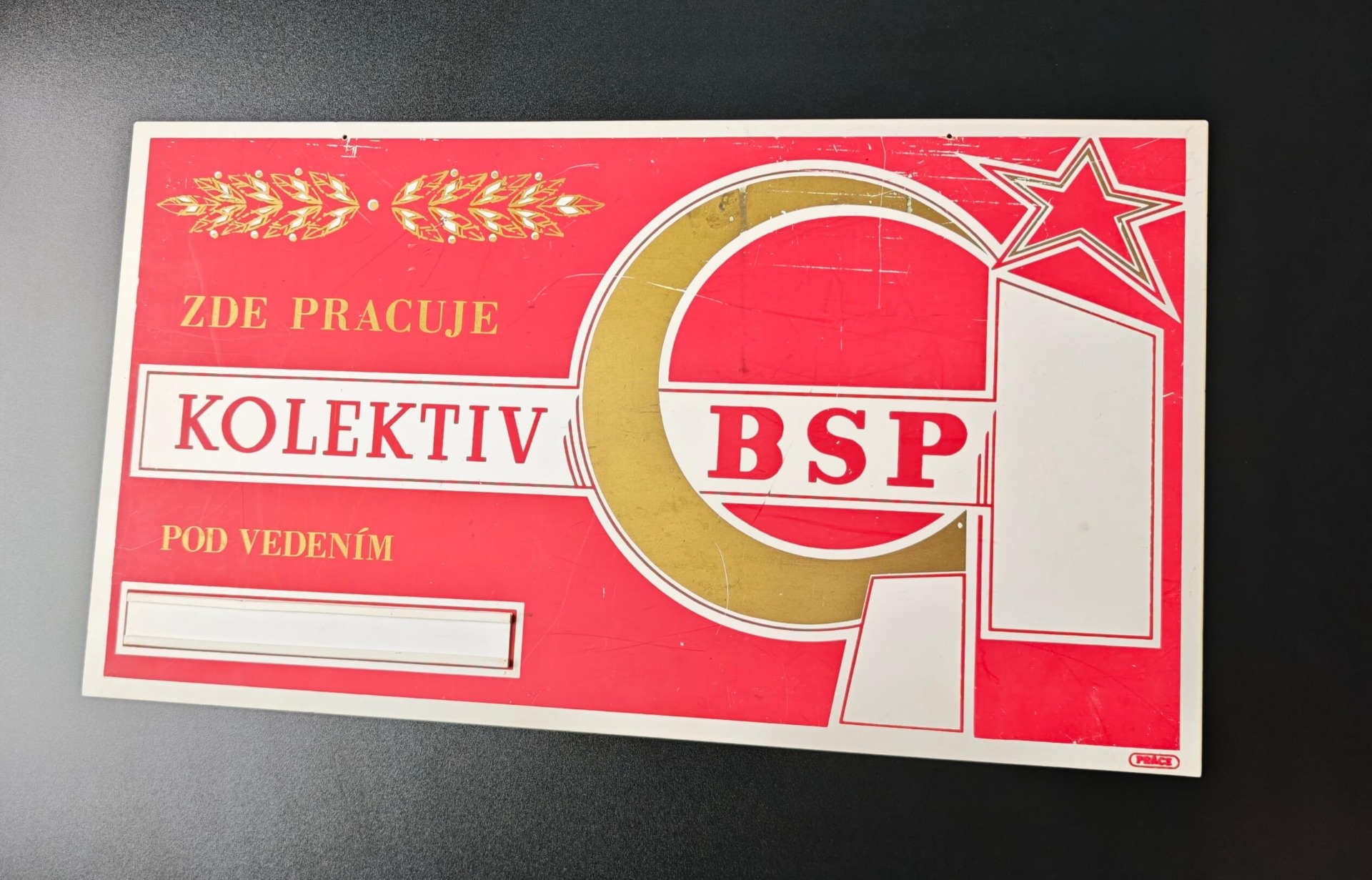 Nabízím k prodeji autentickou, velkoformátovou dobovou ceduli z období socialistického Československa. Tato výrazná tabule sloužila k označení pracoviště "Kolektivu BSP" (Brigády socialistické práce). Jedná se o nepřehlédnutelný kus historie, který dříve zdobil dílny a haly národních podniků.